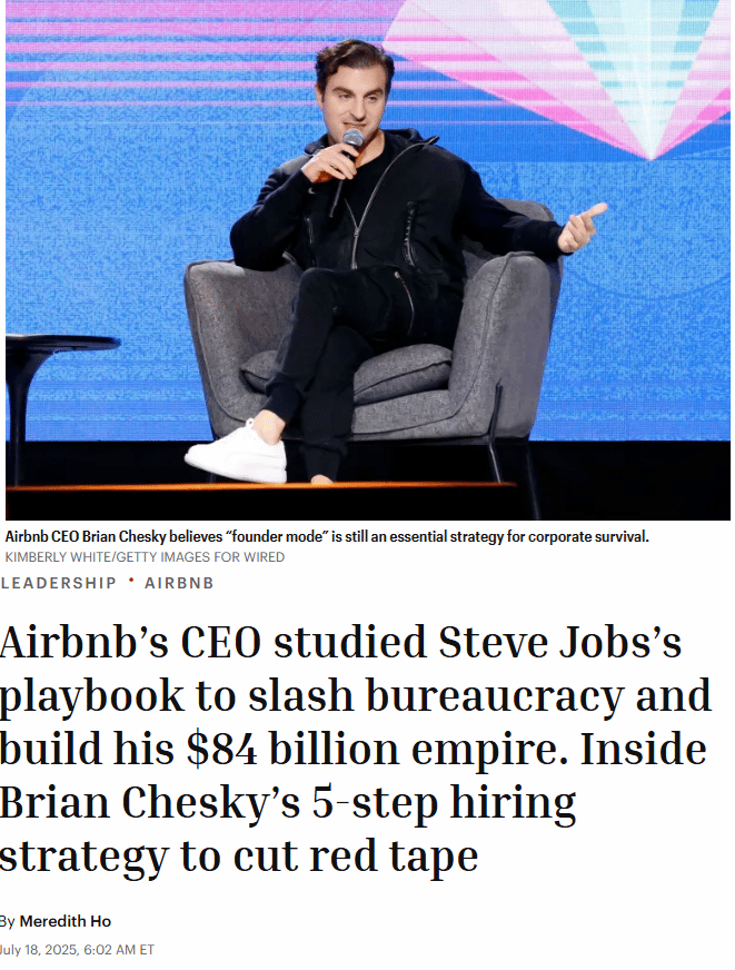 This is exactly why Airbnb's Brian Chesky modeled his hiring approach on Steve Jobs, staying personally involved in every early hire, cutting bureaucracy, and hiring directly into the mission.